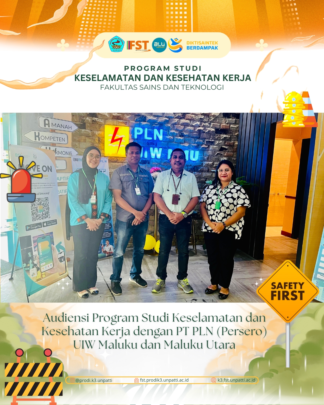 “Program Studi Keselamatan dan Kesehatan Kerja melaksanakan audiensi dengan PT PLN (Persero) Unit Induk Wilayah Maluku dan Maluku Utara sebagai langkah strategis dalam membangun sinergi antara perguruan tinggi dan industri. Pertemuan ini membahas berbagai peluang kerja sama, mulai dari pengembangan kurikulum berbasis praktik, penyediaan fasilitas magang dan praktik lapangan bagi mahasiswa, hingga pelaksanaan kuliah tamu oleh praktisi PLN untuk memperkaya wawasan akademik di bidang ketenagalistrikan. Selain itu, kerja sama ini juga diarahkan pada peningkatan kompetensi dosen serta riset terapan di bidang keselamatan dan kesehatan kerja yang relevan dengan kebutuhan industri energi. Audiensi ini bertujuan memperkuat jejaring kolaborasi sekaligus menyiapkan lulusan Prodi K3 yang kompeten, adaptif, dan siap bersaing di dunia kerja, khususnya dalam sektor energi dan ketenagalistrikan.”